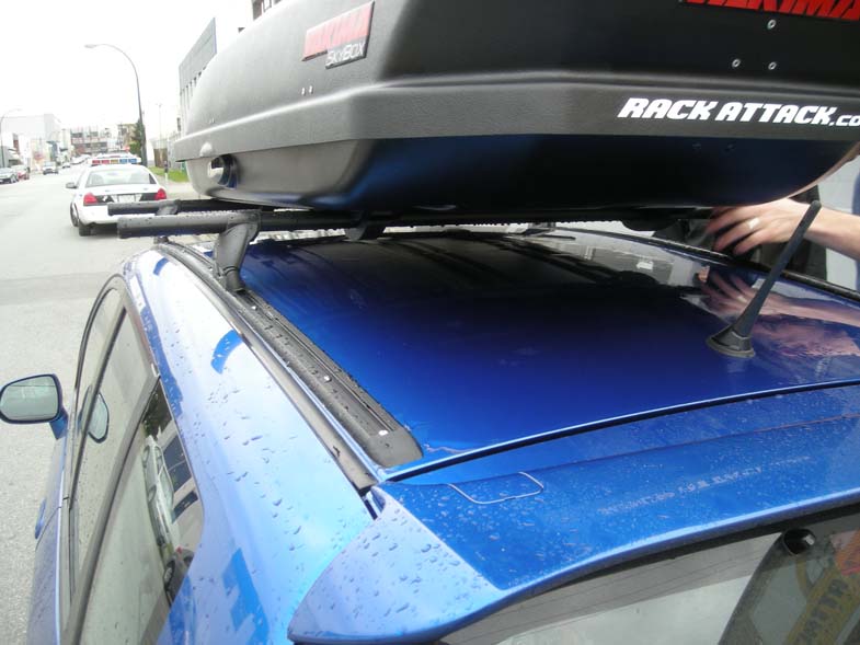 I installed a 60" track on the roof of the fit. This track runs the full length of the car giving the user optimum versatility. Yakima control towers, 48" load bars, and landing pads were set up in the track as a base for a SkyBox 18 cargo box. This box gave the customer enough space for his work gear and recreation gear. The track also gave him the option to widen the distance between the bars and carry any length of kayak in the future.
