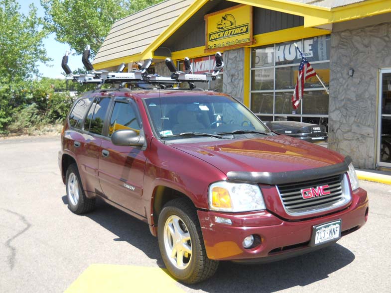 This 2008 GMC Envoy is setup with the Ultimate kayak system carrying two kayaks, both of which can be easily loaded without needing to lift your boat above your head.