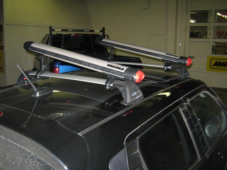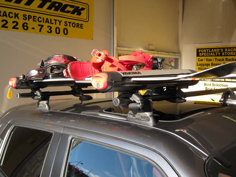 Finally, we added the Yakima Fat Cat 6 ski/snowboard rack. Note that the rack is 'jacked up' on one side...this is so snowboard bindings on the upside-down boards don't hit the roof. It is not always necessary to lift the rack like this, but the customer wanted to start this way just to be safe. Flattening out the rack is simply adjusting two screws on each carrier.
