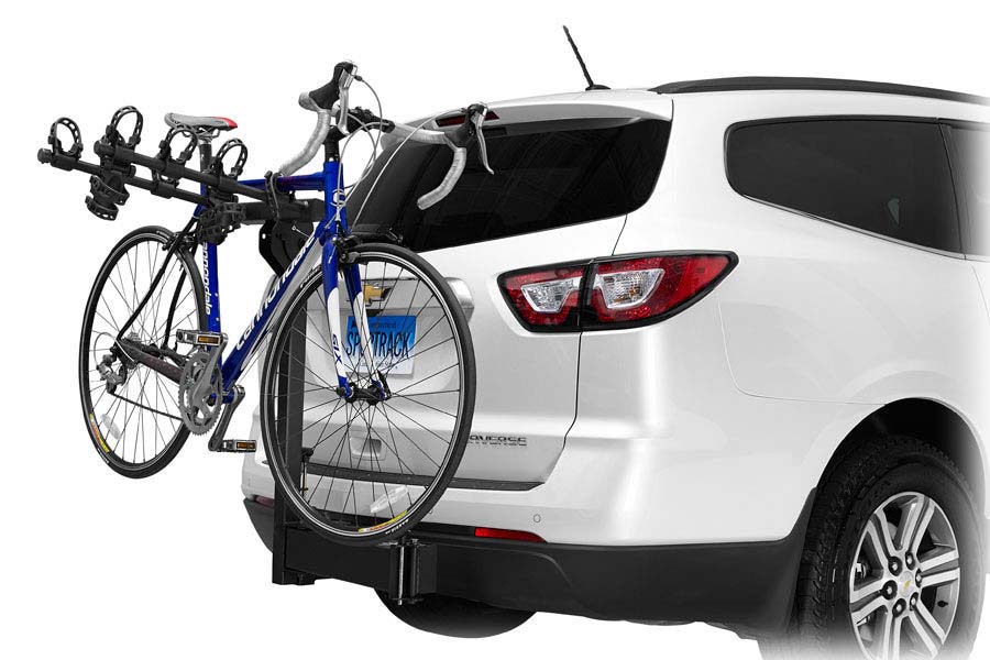 SportRack Ridge Swing 4-Bike Hitch Rack. Eliminate the hassle of unloading bikes to get to your gear. The SportRack Ridge Swing 4 is a heavy-duty hanging-style rack designed exclusively for 2-inch receivers. Its signature swing-away function moves the rack 180 degrees, even when fully loaded, providing total access to your rear door or tailgate. The rack features soft rubber cradles with anti-sway blocks to protect your bike's finish and prevent contact during transit. With a robust steel construction and a sleek black finish, it’s built to handle long road trips and frequent use while keeping your bikes safe and secure.
