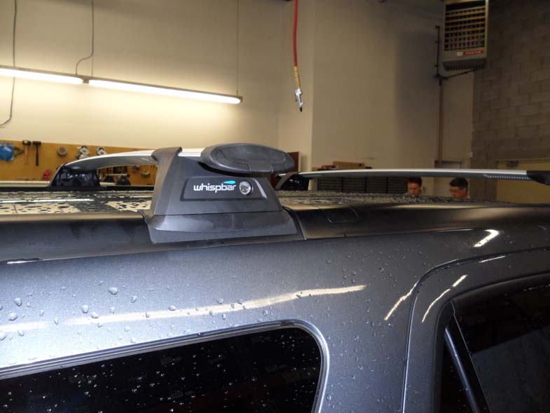 With it's fixed-point mounts straight from the factory, this install was a cinch. This Yakima Whispbar S16 roof rack mounts firmly into the fixed points with no clips to scratch the paint or interfere with the weather-stripping. Plus, because of the engineers at Prorack, the whispbar lives up to its name as the quietest roof rack on the market. With its airfoil shape, and foam padded interior, the whispbar cuts through the air like a hot knife through butter--only quieter, and offers a 110lb carrying capacity, plenty for the cargo box he'll be throwing on for the rest of his road trip.