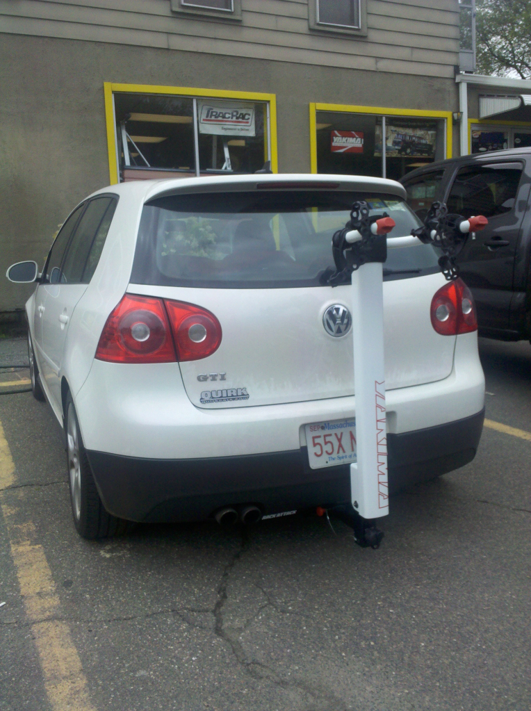 Yakima has come out with a new hitch mounted bike rack and it weighs less than 20lbs! We don't sell a hitch mounted bike rack that weighs less. We recently installed a Hitch on a 2008 Volkswagon GTI, and the customer decided to add on a Yakima High Lite 2 Bike carrier. The High Lite comes in both white and silver, and either a 2 bike or 3 bike option. Naturally, he decided to get the white with his white GTI.
