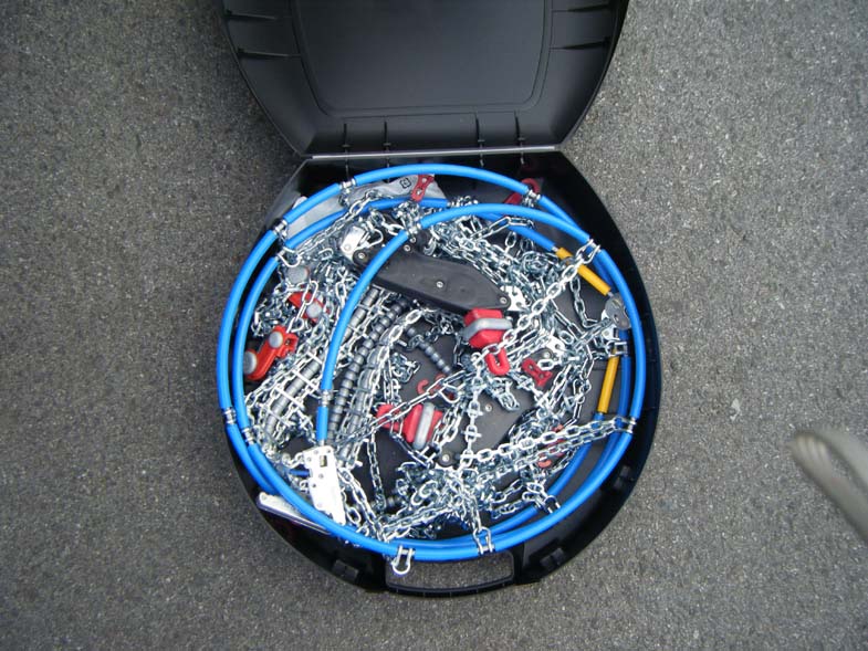 2.Put the Chains around the back of the tire with the blue cord farthest from you and the chains toward you: